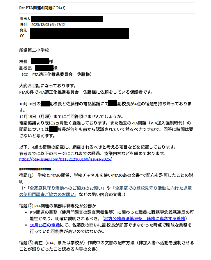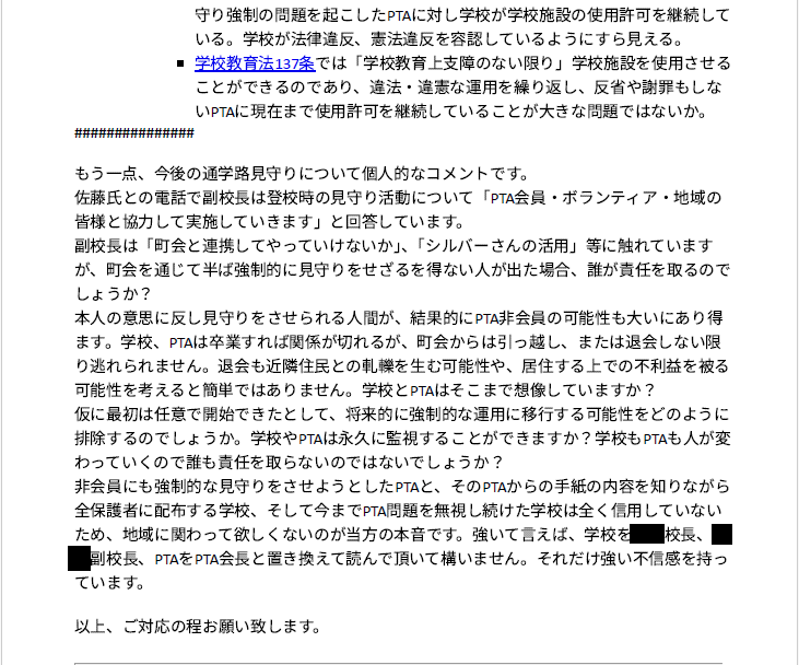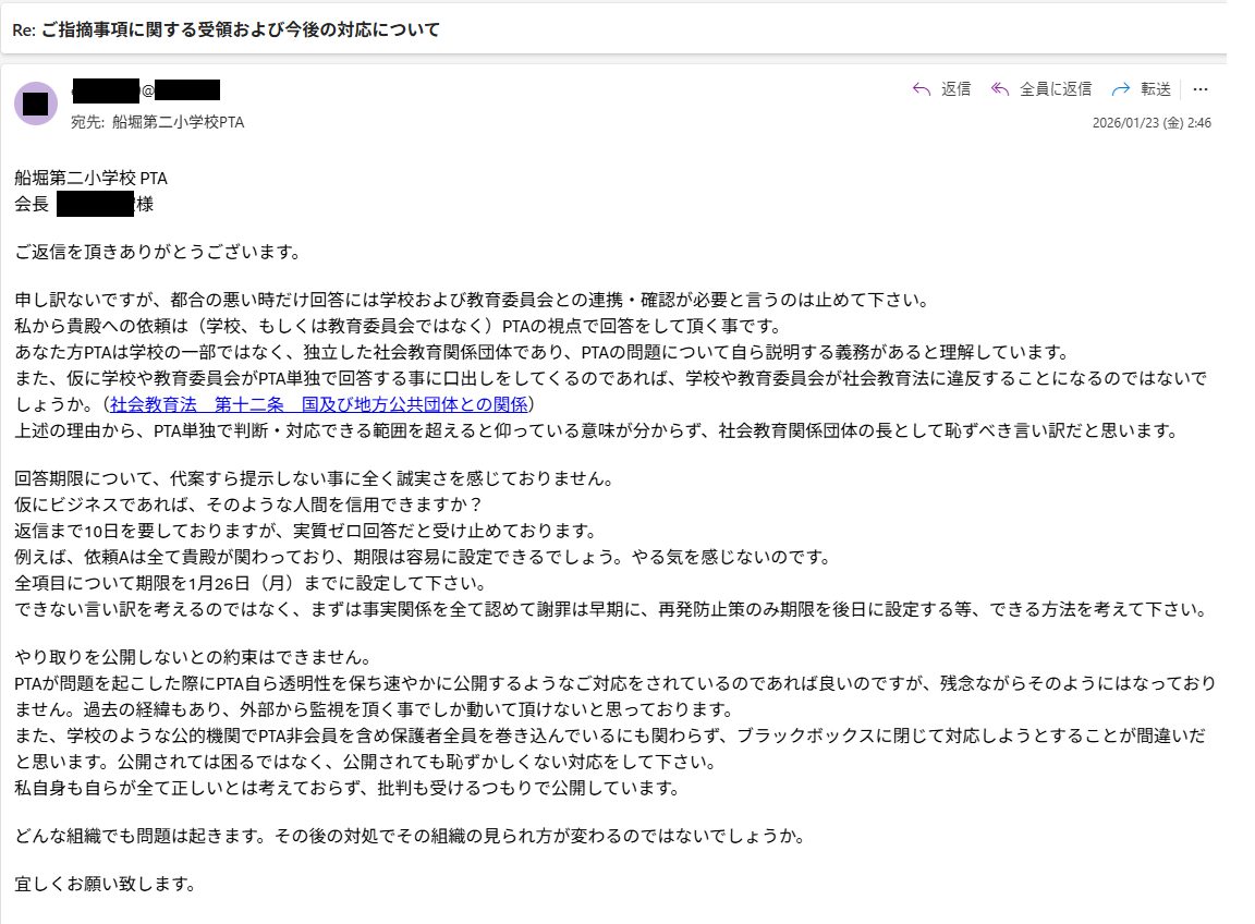 - PTA会長からの返信に対し、当方から問題点を指摘するメールを送付。