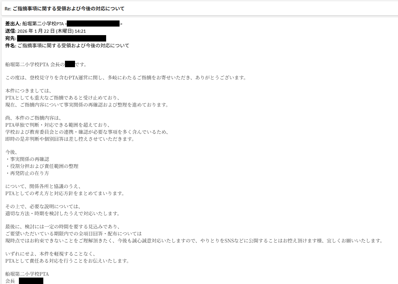 - PTA会長から返信あり。ただし、中身が無く実質ゼロ回答。