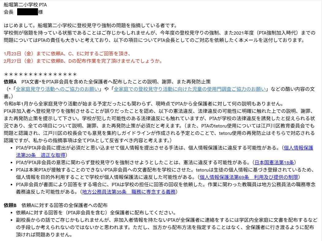 - 2025年度の登校見守り強制問題と、それ以前の過去問題に対しての説明、謝罪、再発防止策を求める。