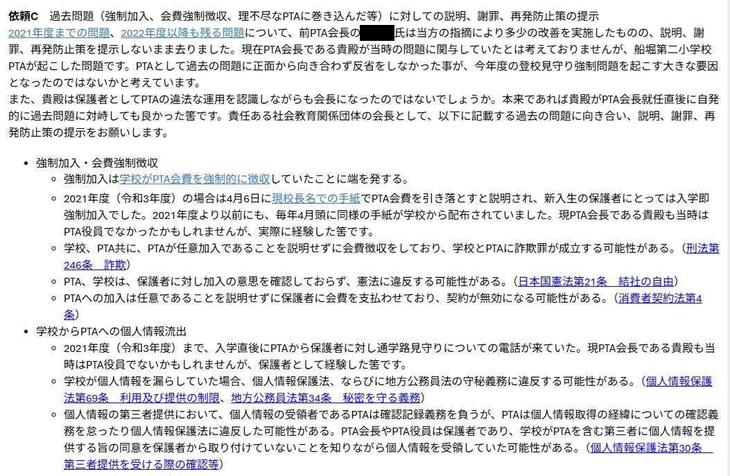 - 消費者契約法第4条により契約が無効になる可能性があるにもかかわらず、PTA独自の見解により会費返金をしないと説明しており、非常に悪質である。