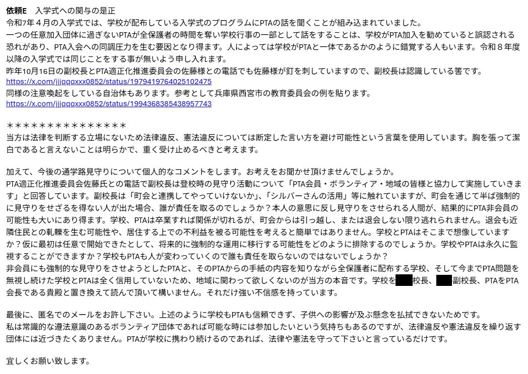 - 過去数々の法律違反、憲法違反を犯した可能性のあるPTAであるが、それに対する説明や謝罪を行っていない。過去の反省を生かさず、2025年度も見守り強制の問題を起こしたPTAに対し学校が学校施設の使用許可を継続している。学校が法律違反、憲法違反を容認しているようにすら見える。