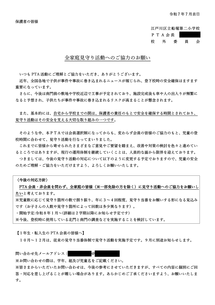 - 2026年1月からPTA会員・非会員を問わず、全家庭の保護者に見守りをさせるというPTAからの宣告。