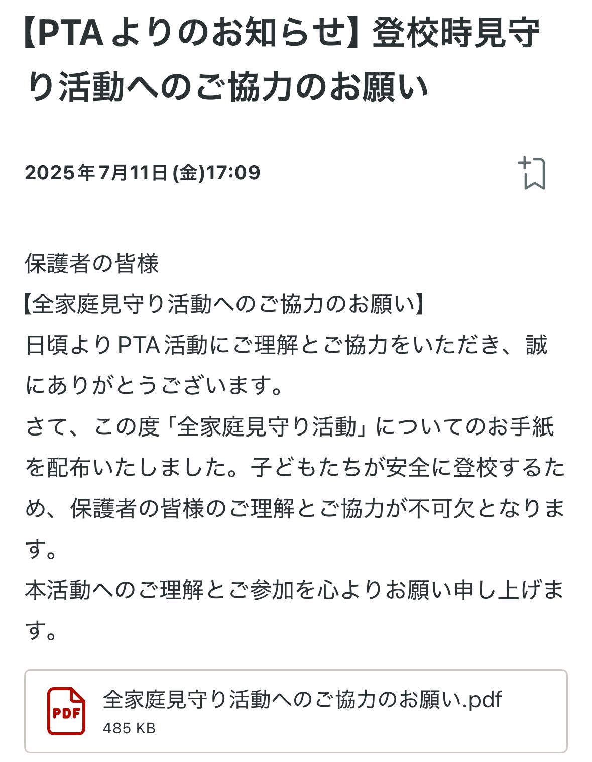 2025年度にはPTAが学校の連絡アプリを通じてPTA非会員含む全保護者に見守りを強制しようとした問題が発生しました。