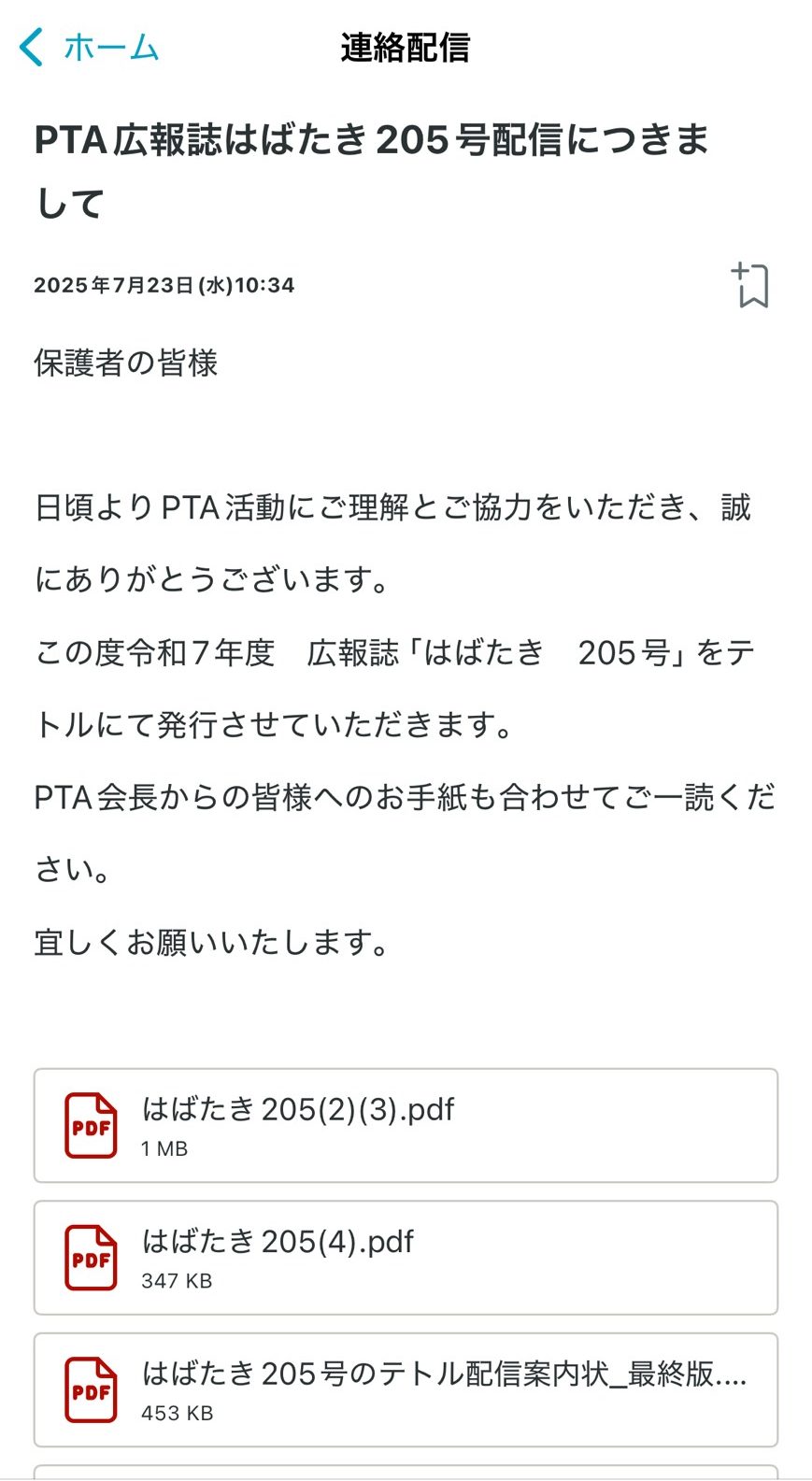 - tetoruを通じて、PTAがPTA文書「はばたき205号のテトル配信に関して」とPTA広報誌「はばたき」が配布される。